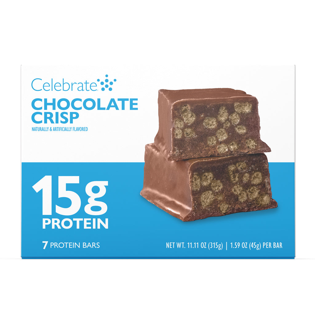 Celebrate's bariatric Protein Bars provide 15 g of high-quality protein. Each bar also contains fiber, has a calorie range of 130-160, and a net carbohydrate range between 14-17 g. Bars are available in 6 flavours (Salted Toffee Pretzel, Chocolate Crisp, Fluffy Lemon, Fluffy Nutter, Fluffy Choco Vanilla Crisp and Fluffy Berry).