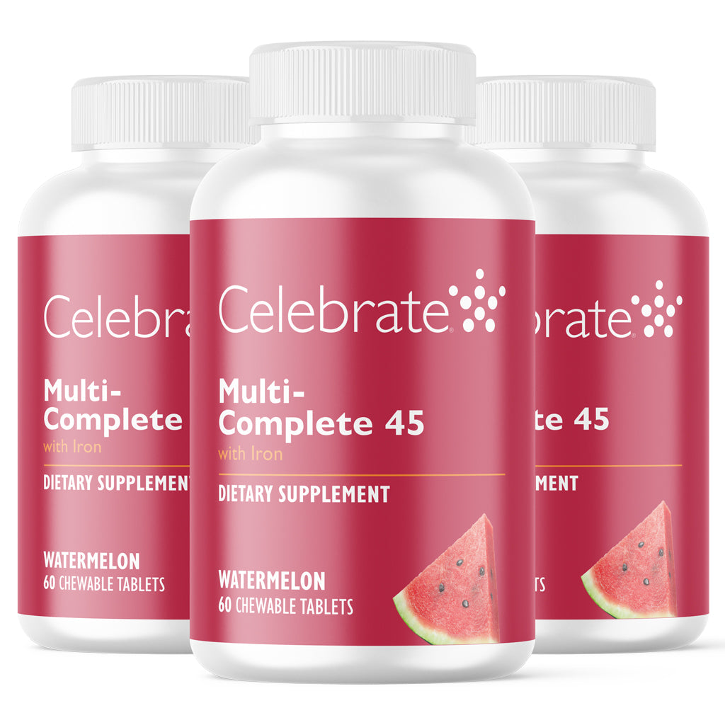 Celebrate Multi-Complete 45 contains all of the vitamins and minerals in a two per day, split dose option, patients just need to add calcium. This option is perfect for the patient who is sensitive to higher doses and needs to split dosing for better tolerance. This bariatric multivitamin meets the ASMBS standards of multivitamin and iron after bariatric surgery. This integrated formula provides maximum bioavailability as we carefully selected each form of vitamin and mineral to enhance interaction and absorption. MC-45 is available in two chewable flavours (Forest Berry and Watermelon) or in a capsule..