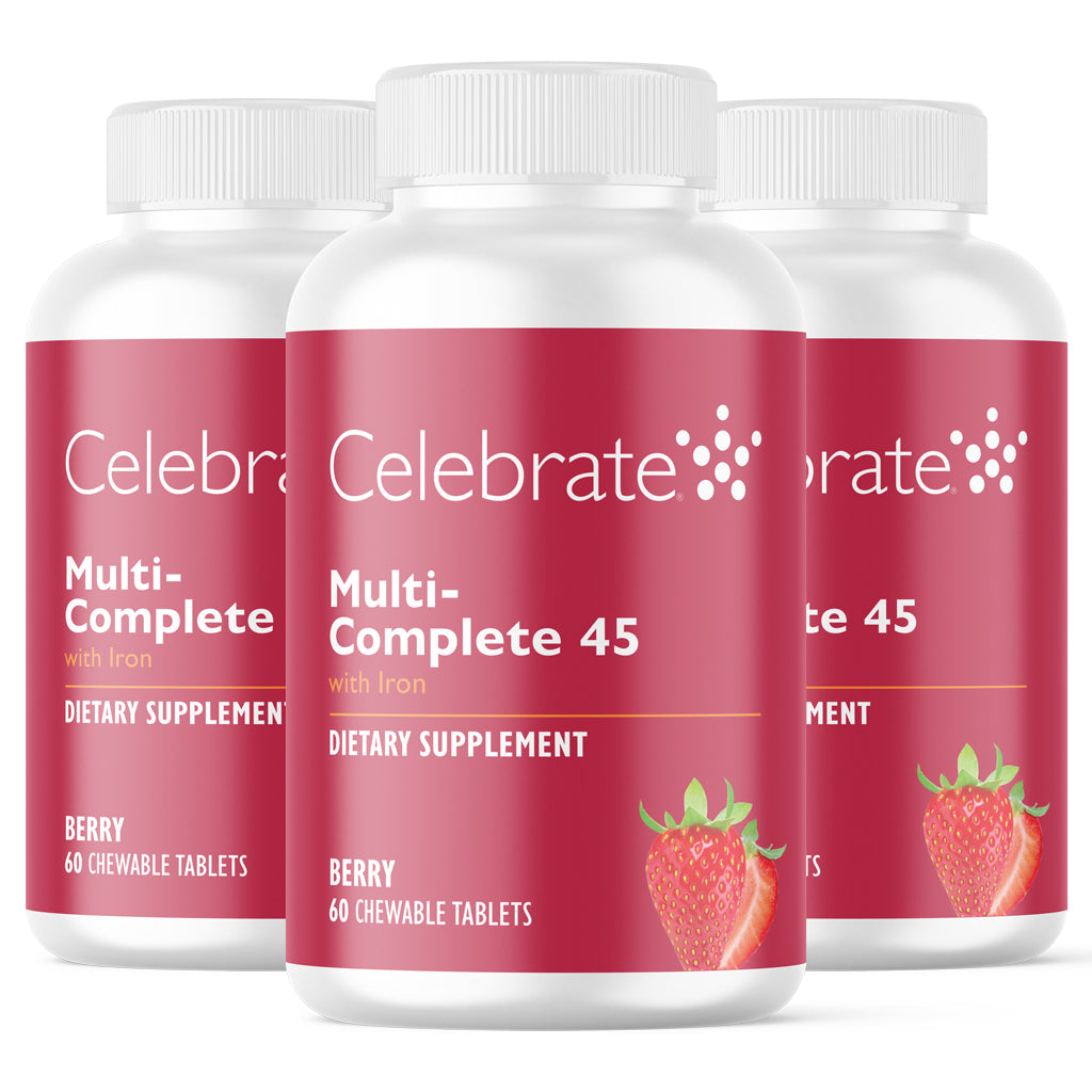 Celebrate Multi-Complete 45 contains all of the vitamins and minerals in a two per day, split dose option, patients just need to add calcium. This option is perfect for the patient who is sensitive to higher doses and needs to split dosing for better tolerance. This bariatric multivitamin meets the ASMBS standards of multivitamin and iron after bariatric surgery. This integrated formula provides maximum bioavailability as we carefully selected each form of vitamin and mineral to enhance interaction and absorption. MC-45 is available in two chewable flavours (Forest Berry and Watermelon) or in a capsule..